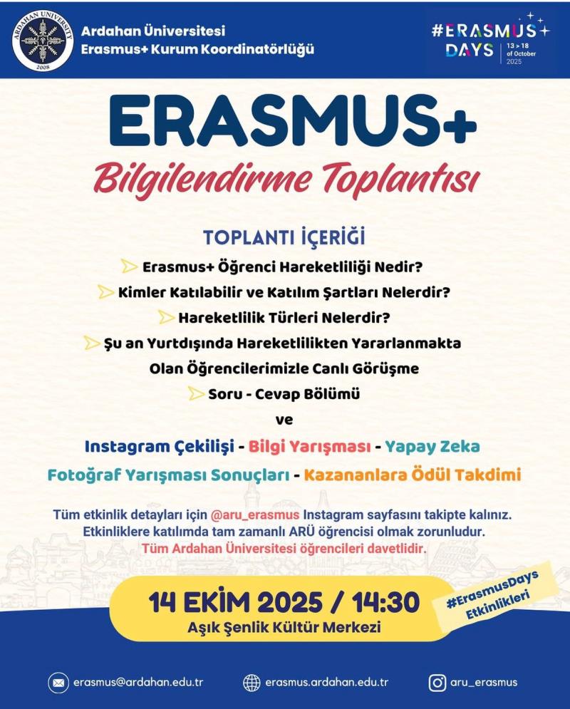 Üniversitemiz Erasmus+ Kurum Ofisi tarafından, 14 Ekim 2025 Salı günü saat 14.30’da Aşık Şenlik Kültür Merkezinde öğrencilerimize yönelik bir bilgilendirme toplantısı düzenlenecektir.
