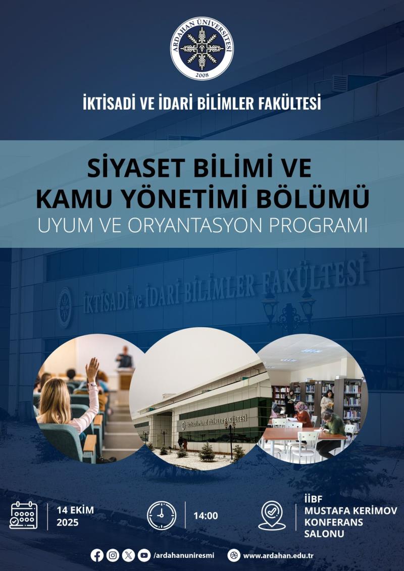 Ardahan Üniversitesi İktisadi ve İdari Bilimler Fakültesi Siyaset Bilimi ve Kamu Yönetimi Bölümü tarafından, yeni kayıt yaptıran öğrencilerimizin üniversitemize ve bölümümüze uyum sürecini kolaylaştırmak amacıyla “Uyum ve Oryantasyon Programı” düzenlenecektir.